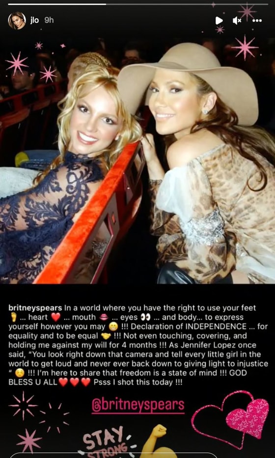 Как однажды сказала Джей Ло, вы смотрите прямо в эту камеру и говорите каждой девочке в этом мире, что она должна быть услышанной, чтобы никогда не сталкиваться с несправедливостью. Свобода — это душевное состояние, – процитировала Бритни Спирс слова Лопес.
