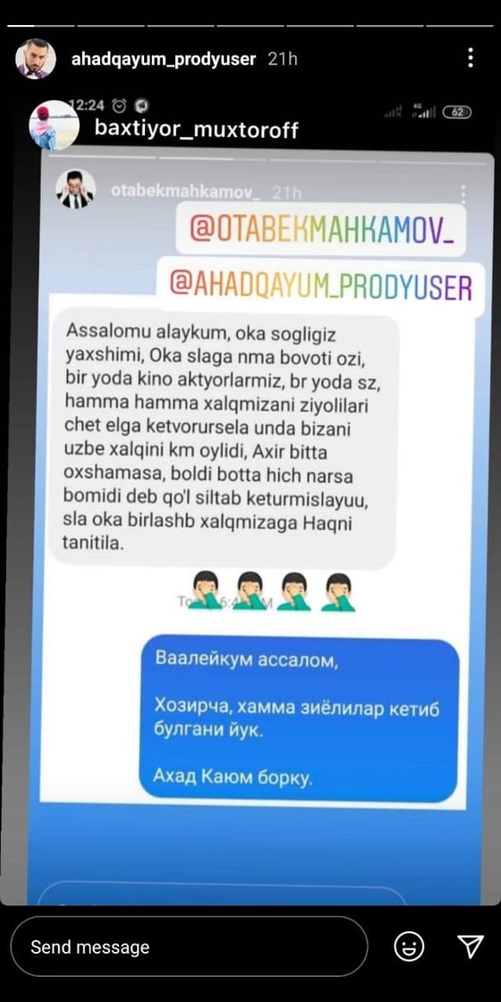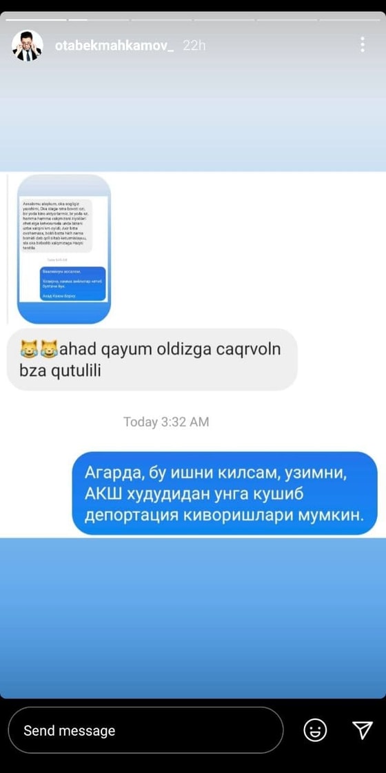 Актер Отабек Махкамов, на данный момент проживающий в США, опубликовал у себя в stories ответ на сообщение своего подписчика.