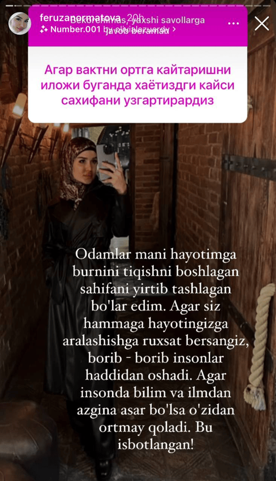 Недавно актриса Феруза Норматова решила ответить на интересные вопросы подписчиков. Кто-то решил узнать, что бы Феруза поменяла в своей жизни, если бы могла перемещаться во времени.