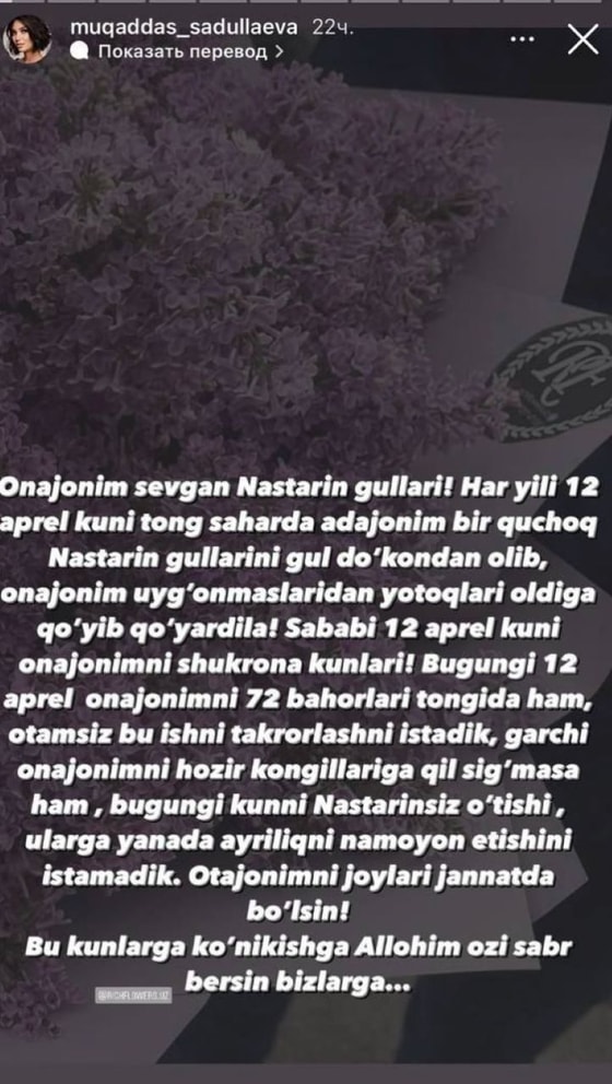 Накануне знаменитость рассказала о традиции отца, которую он делал каждый год 12 апреля. Как оказалось, в этот день рождения ее матери Гульчехры Садуллаевой.