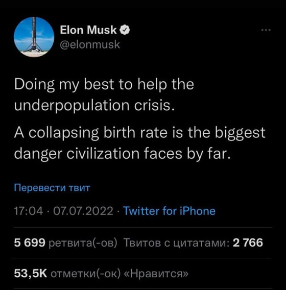 Делаю все возможное, чтобы помочь в борьбе с депопуляцией человечества. Резкое снижение рождаемости это намного более серьезная угроза нашей цивилизации, чем что-либо еще, – написал Маск.
