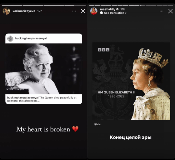 По словам Марьям Тилляевой это «конец целой эры». Сестра Мунисы Ризаевой Карима выказалась: «Мое сердце разбито». Кроме того, фотографии Елизаветы II опубликовали Шахзода Мухаммедова и Райхон Ганиева.