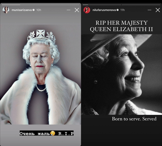 Конечно же, узбекские звезды отреагировали на эту печальную новость. К примеру, Муниса Ризаева опубликовала фото королевы и подписала: «Очень жаль. Покойтесь с миром». Также Нилуфар Усманова написала «Рождена была служить. Отслужила».