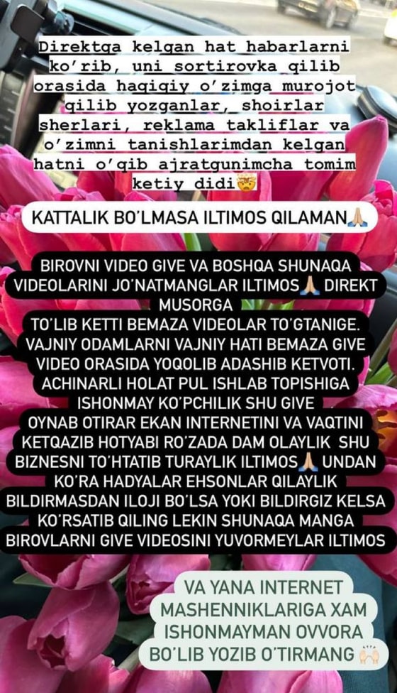 Кроме этого, Нилюфар Усманова предупредила поклонников о том, чтобы те не участвовали в гивах якобы от нее. По словам знаменитости, она не устраивает конкурсы, и у нее только единственный аккаунт в Instagram.