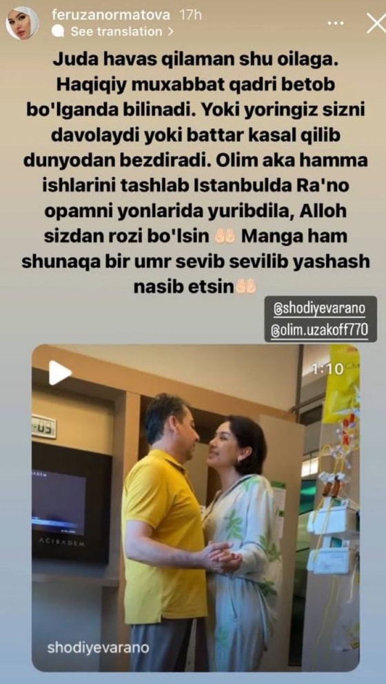 Феруза Норматова отметила тот факт, что супругу артистки не составило труда бросить дела и уехать с ней в Стамбул, чтобы продолжить лечение.