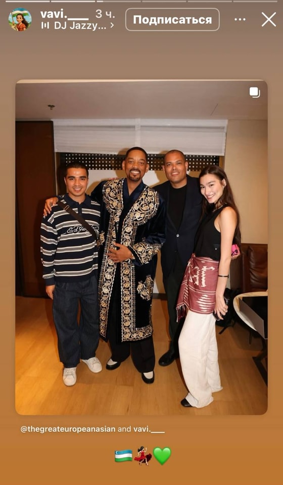 Знаменитый голливудский актер Уилл Смит пополнил свой гардероб традиционным узбекским нарядом — чапаном и тюбетейкой. Этот национальный подарок ему преподнесли узбекская супермодель Vazira John и популярный блогер Саидазим Ризаев во время личной встречи.