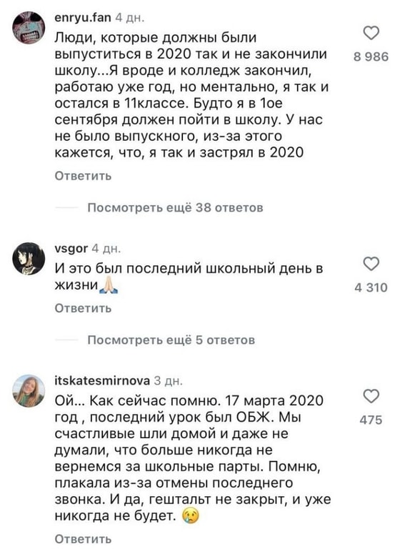 Мы до сих пор помним наш последний день в школе, когда даже не подозревали, что больше никогда не вернемся туда, — пишут пользователи.