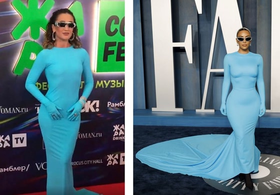 Ольга Бузова появилась на красной дорожке в платье со шлейфом лазурного оттенка, серебристых лодочках и блестящих очках. Посмотрев на образ сразу же можно понять, что исполнительница вдохновилась Ким Кардашьян.