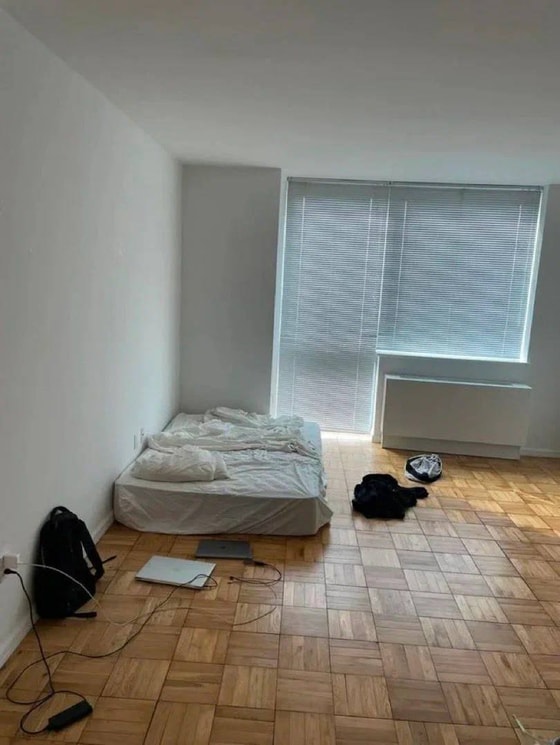На фото можно увидеть практически пустую комнату с большим матрасом, рюкзаком и двумя ноутбуками.