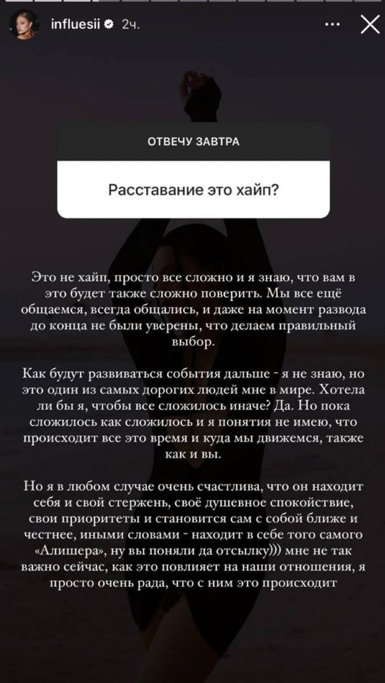Девушка откровенно написала, что развод с рэпером «не хайп, но все достаточно сложно». Она рассказала, что бывшие все еще общаются и Моргенштерн является самым дорогим человеком для нее.