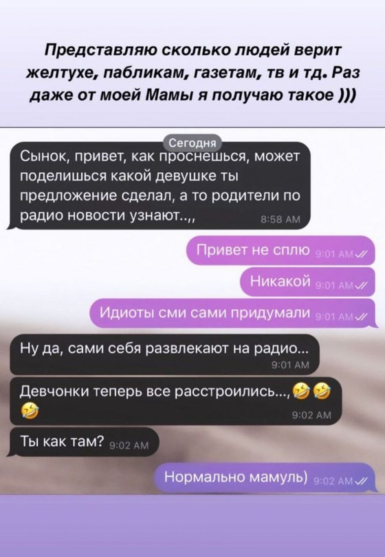 Однако спустя время исполнитель резко отреагировал на слухи о предстоящей свадьбе. В своем Instagram-аккаунте он опубликовал переписку с мамой, которая интересуется у сына, кому он сделал предложение, и почему семья ничего не знает об этом.