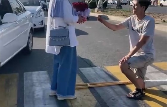 На видео можно увидеть, как парень на пешеходном переходе падает на колено перед девушкой и вручает ей цветы. Далее вайнер делает предложение руки и сердца, но получает отказ.
