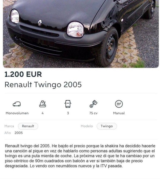Renault Twingo 2005 года выпуска. Мне пришлось снизить цену, потому что Шакира решила записать песню о бывшем, вместо того, чтобы поговорить с ним, как взрослые люди, – написал мужчина.