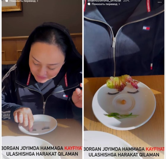 С этими словами Шахло Зоирова приклеила ресницы к тарелке и с помощью продуктов салата изобразила смайлик. Далее она позвала официанта и передала тарелку повару. К слову, сотрудники заведения удивились, но обрадовались и решили сфотографироваться с звездой.