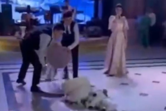 На видео два парня выносят трехъярусный торт, но неожиданно роняют его. Молодожены расстроились, но не стали подавать виду, а жених и вовсе рассмеялся.
