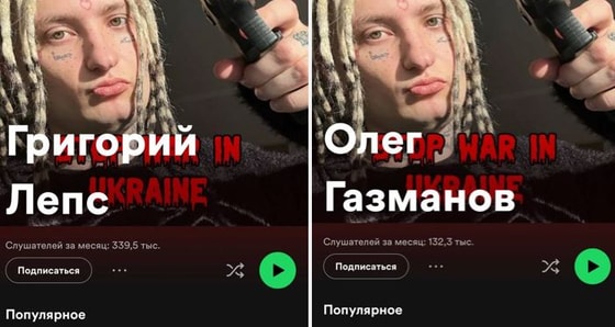 Аккаунты российских исполнителей Григория Лепса и Олега Газманова на популярной платформе Spotify были взломаны. Теперь вместо изображений артистов там появилось фото украинского певца Clonnex из Львова, который с пистолетом в руке целится в камеру.