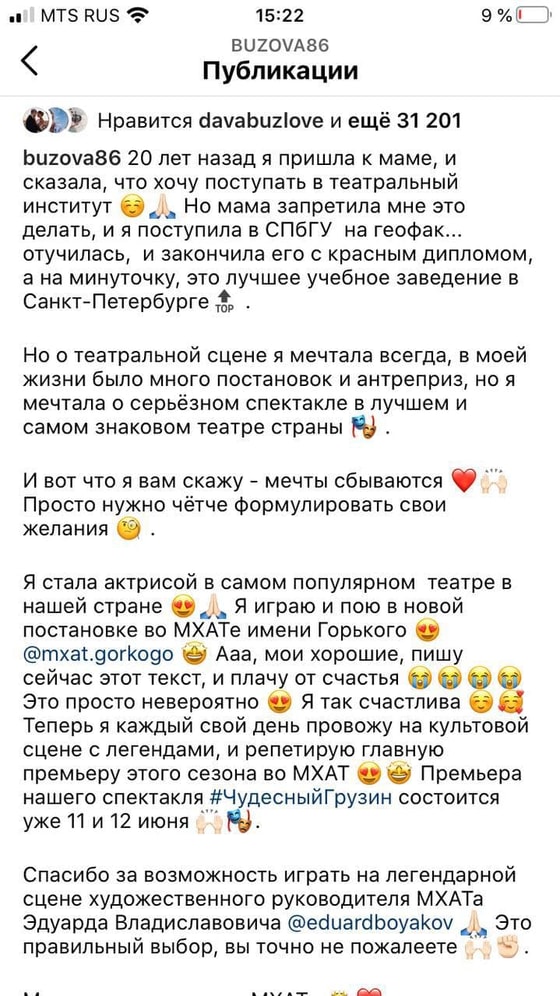 И вот, наконец ей удалось стать актрисой и более того, в скором времени Бузову можно будет увидеть в новой постановке во МХАТе имени Горького. Как сообщила артистка, теперь она больше проводит время на культовой сцене и репетирует главный анонс этого сезона.