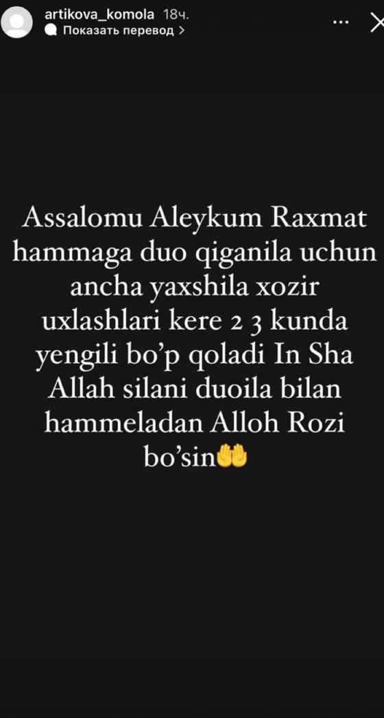 Спасибо всем за молитвы и поддержку. Ему намного лучше, но сейчас необходим отдых и сон, – написала Камола Артикова.