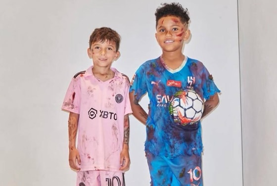 На снимках Сейнт Уэст позирует вместе с другом в формах футболистов Неймара и Месси — мальчики при этом «украшены» бутафорской кровью.