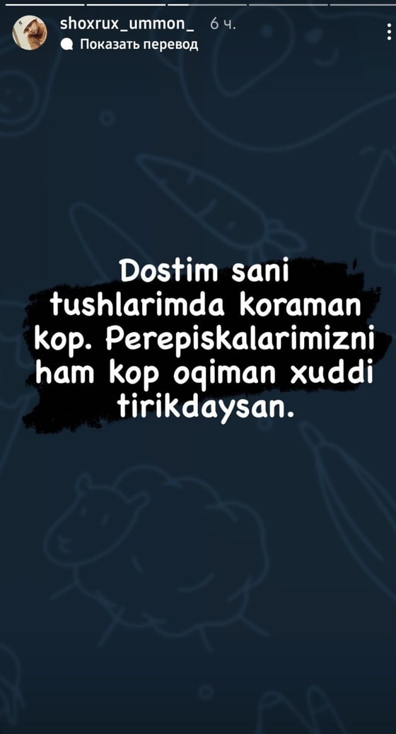 Бывший участник музыкальной группы «Уммон» Шохрух поделился старой перепиской с умершим от тяжелой болезни Джасуром Рафиковым. По словам певца, его друг до сих пор снится ему.