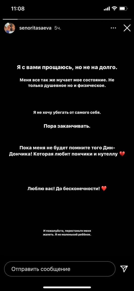 Дина опубликовала историю, где по словам девушки, ее очень мучает душевное и физическое состояние, поэтому ненадолго она планирует приостановить ведение соцсетей.