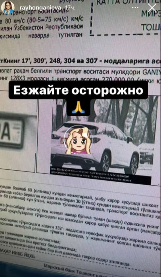 Она показала письмо за нарушение ПДД, судя по снимку, Райхон чуть-чуть превысила скорость. Итак, исполнительница попросила своих поклонников соблюдать правила и быть осторожнее.