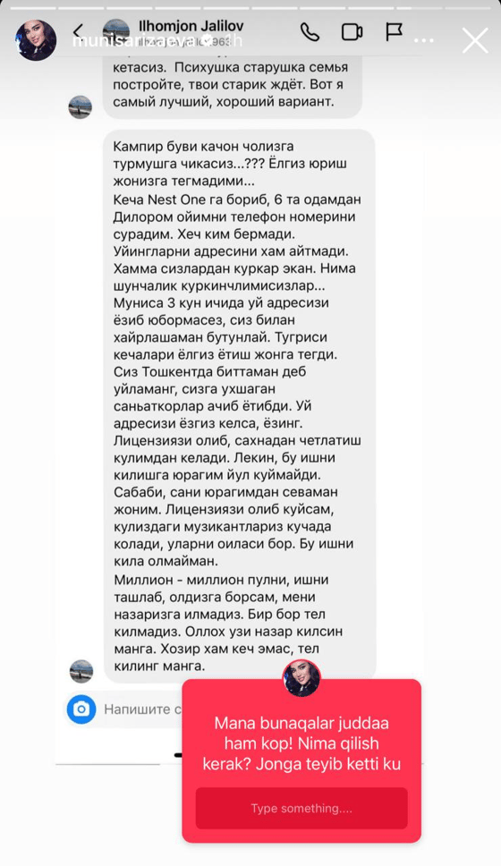 Недавно певица Муниса Ризаева опубликовала сообщение одного из подписчиков. В огромном тексте один из подписчиков заявил, что не может найти номер телефона мамы артистки.