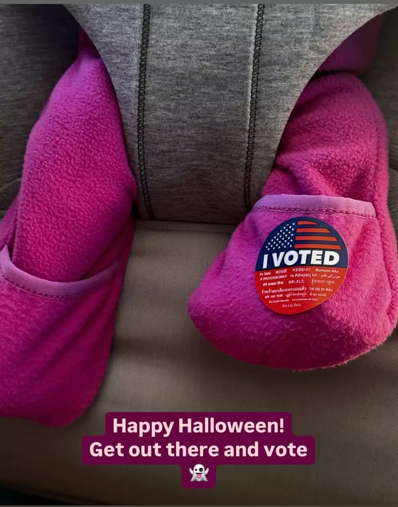На фотографии, которую модель опубликовала в Instagram, можно увидеть ножки малыша, уютно устроившегося в рюкзаке-кенгуру. Джек был одет в яркий пурпурный комбинезон. Хейли сопроводила пост поздравлением с Хэллоуином.