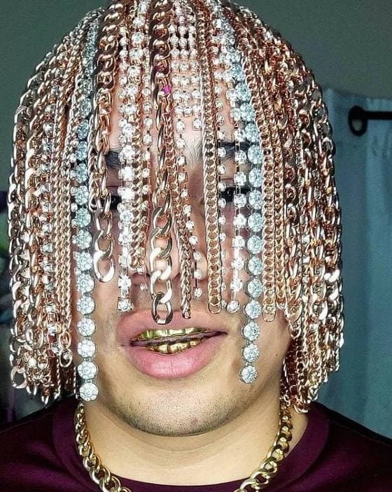 Необычен он тем, что теперь вместо волос у исполнителя свисают золотые цепи. Молодой человек утверждает, что носит ювелирные украшения благодаря вставленным в кожу крючкам.