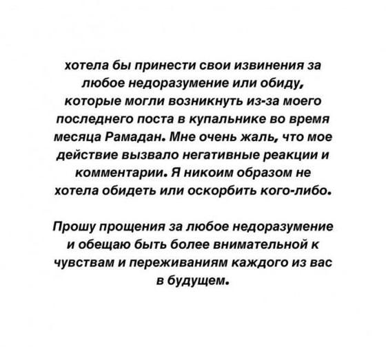 По мнению комментаторов, она не должна была делиться подобным контентом в месяц Рамадан. Знаменитость уже удалила видео и извинилась перед подписчиками.
