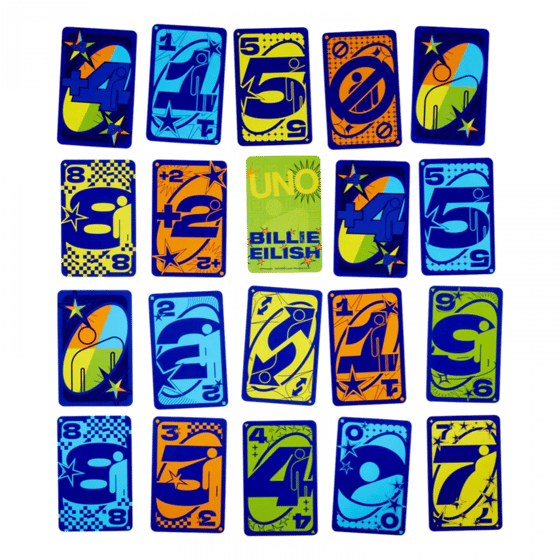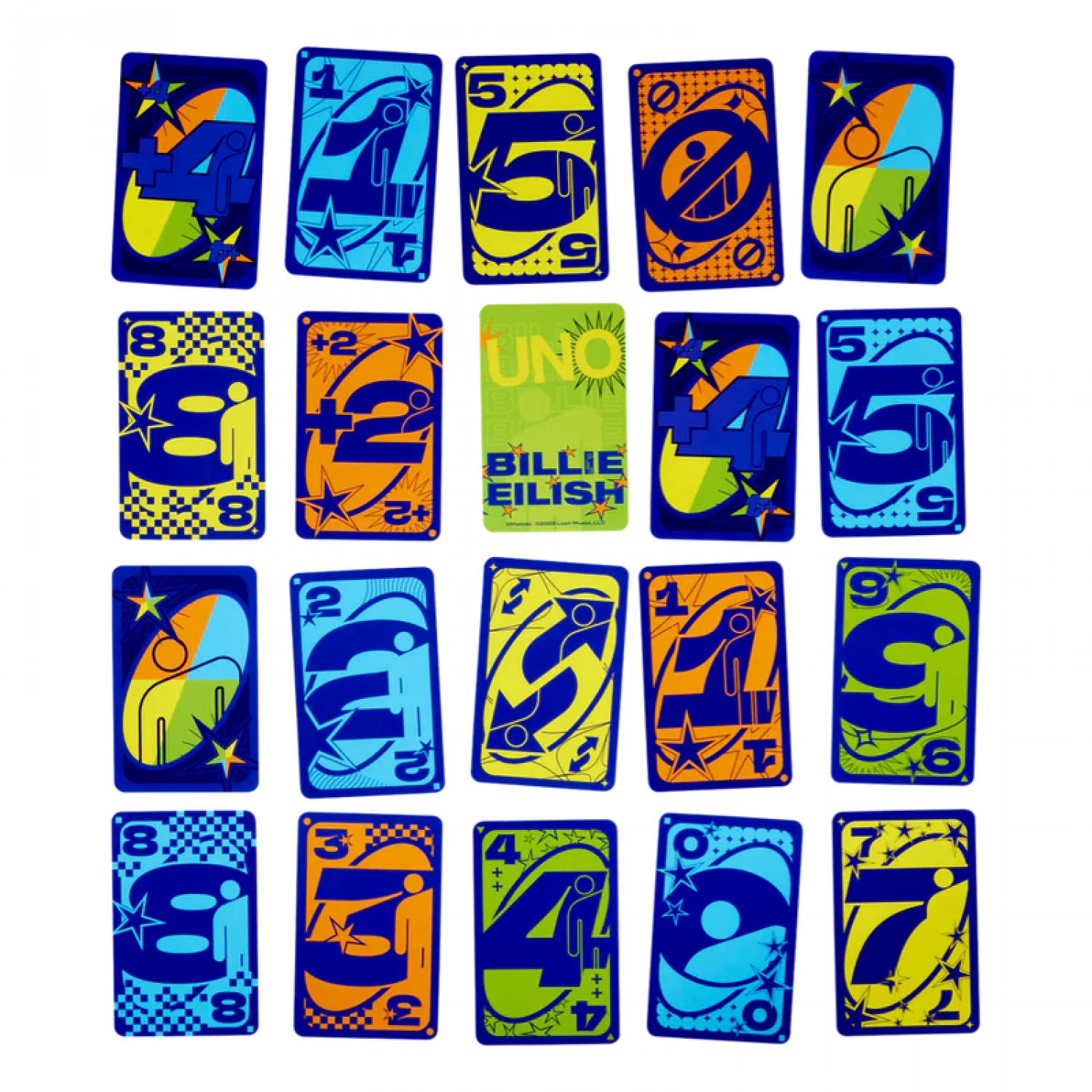Американская певица Билли Айлиш представила лимитированную версию популярной настольной игры Uno, выполненную в фирменной зелено-синей гамме и украшенную ее знаменитым логотипом Blohsh.