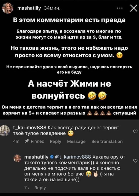 Ору от такого тупого комментария. Я, конечно, детально не подсчитывала, но, к счастью, он намного богаче меня. Он меня с детства терпит, а я его, так как он всегда кормит меня, – ответила блогер.