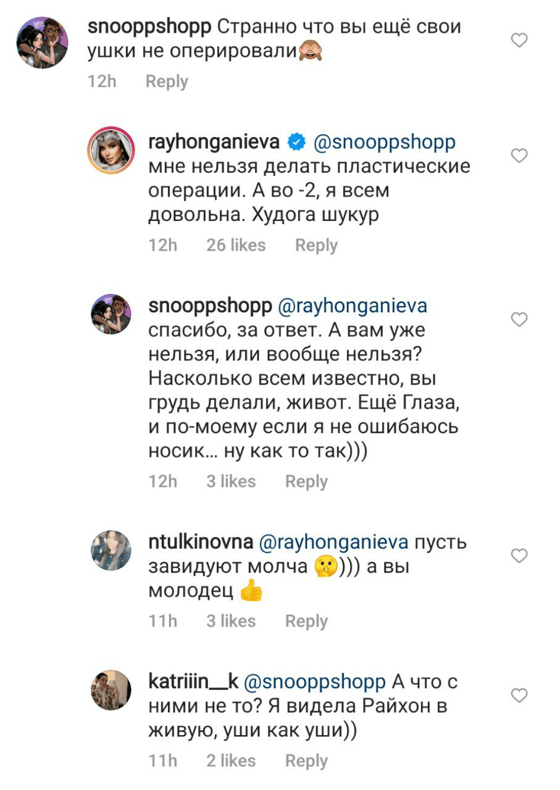 Подписчики не успокоились на этом и стали расспрашивать, почему артистке нельзя делать пластические операции. Но Райхон больше не давала ответов.