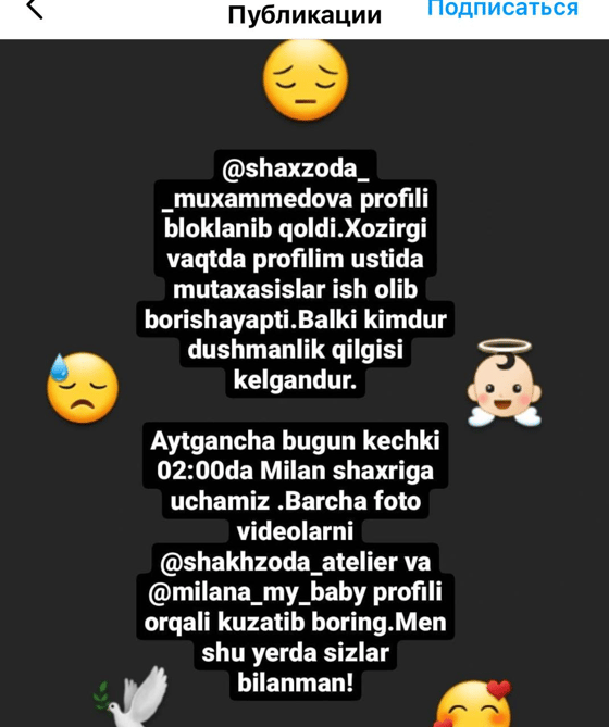 На днях знаменитость сообщила, что уже отправилась в Милан, не успела она отбыть, как у нее возникли проблемы с Instagram аккаунтом. Оказалось, что профиль Шахзоды с аудиторией в 4 миллиона подписчиков был заблокирован.