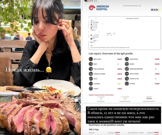 По словам Усмановой, она приняла решение отказаться от продуктов с содержанием мяса еще 15 лет назад. Но судя по результатам диагностики, в списке разрешенных к употреблению продуктов оказалось именно мясо. Теперь инста-блогер должна включить его в свой рацион.