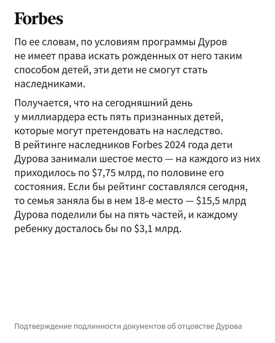 23 июля 2023 года Ирина Болгар, проживающая в Швейцарии, обратилась в редакцию Forbes с просьбой внести изменения в рейтинг миллиардеров. Она утверждает, что количество детей основателя Telegram Павла Дурова следует изменить с двух до пяти. По словам Болгар, она является матерью троих младших детей Дурова.