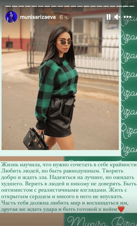 Певица Муниса Ризаева в своём блоге не раз рассказывала о предательствах своих близких, о том, как жизнь учит ее быть сильнее и жестче. В очередной раз артистка опубликовала у себя в stories, в котором делится с подписчиками советом для жизни