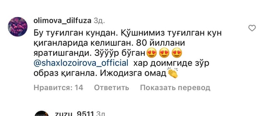 На днях узбекская юмористка Шахло Зоирова опубликовала серию снимков, которые приятно удивили ее подписчиков.