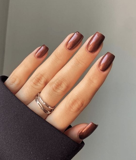 Цвет является универсальным – он подходит ко всему и создает уютное осеннее настроение. В последнее время девушки отдают предпочтение каштановому маникюру. В отличие от классического коричневого оттенок каштана более теплый, иногда карамельный и с красноватыми тонами.