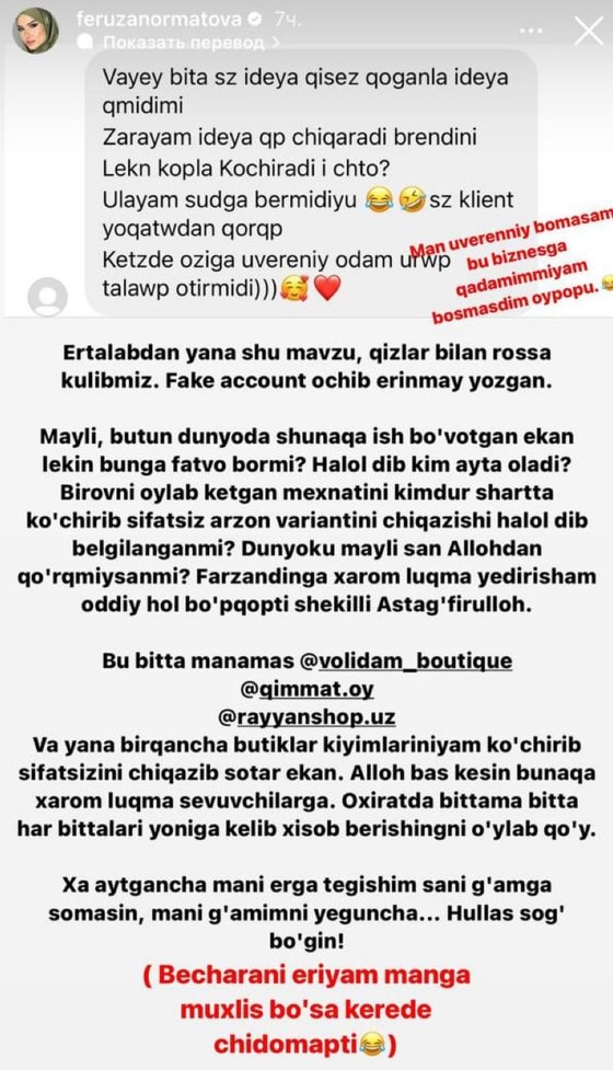 Ладно, пусть так поступают во всем мире, но зачем вы так делаете? Как вы можете приносить домой деньги, заработанные не честным путем. Разве справедливо, когда ты месяцами работаешь над моделью, а кто-то просто копирует некачественный вариант твоего продукта? – закончила Феруза Норматова