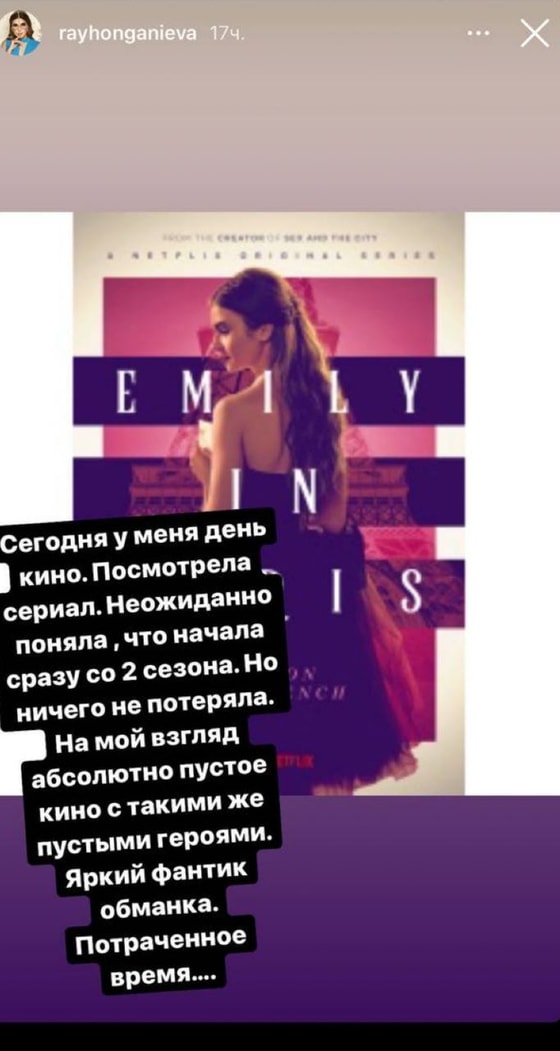 Исполнительница Райхон Ганиева, достаточно часто дающая рекомендации по фильмам, высказала свое мнение касательно американского сериала «Эмили в Париже».