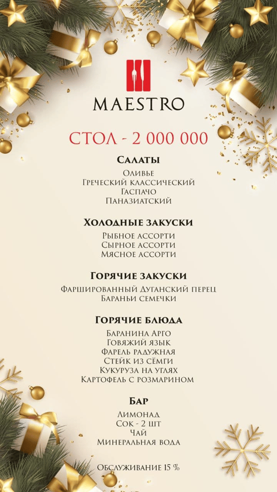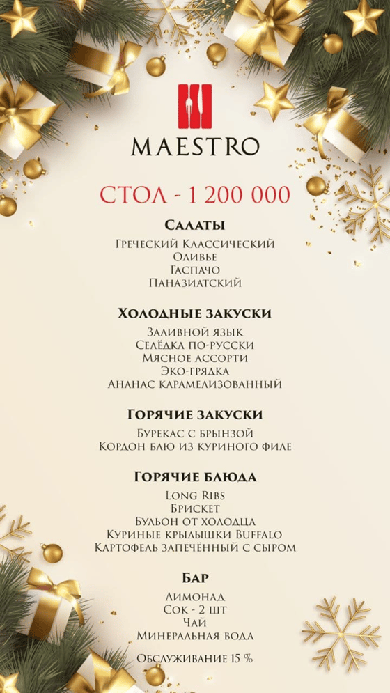 Также вас ждут весёлые конкурсы и интерактивы от ведущего, новогодняя программа с шоу-балетом, музыкальная программа от диджея Macarella и множество фирменных подарков от ресторана Maestro.