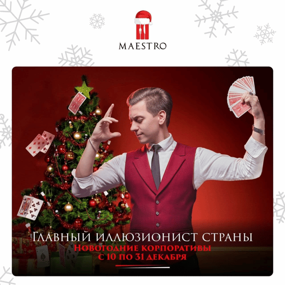 Иллюзионист Дмитрий Поляков вместе с Дедом Морозом и Снегурочкой наполнят праздничные вечера волшебством и магией.