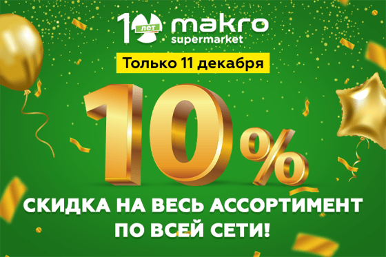 Только 11 декабря, весь ассортимент, представленный в филиалах сети будет пробиваться на кассе с учётом 10% скидки. Система лояльности E-Makro в этот день может использоваться исключительно для снятия ранее накопленных баллов.