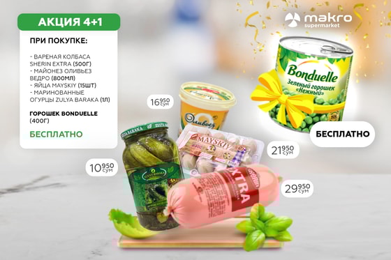 Условия акции очень просты. Для того, чтобы получить горошек Bonduelle (400г) бесплатно, необходимо приобрести 4 наименования, (изображенные на имидже) которые представлены на полках супермаркетов уже по специальным ценам. В регионах может быть представлен другой бренд яиц и маринованных огурцов.