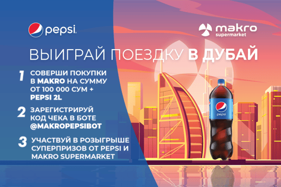 - совершить покупку в одном из филиалов сети супермаркетов Makro на сумму от 100 000 сум и более, включив в покупку Pepsi (2 л);