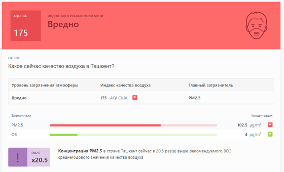 В 17:25 станция мониторинга в столице Узбекистана показывала результат в 175 AQI. Концентрация PM2.5 — в 20,5 раза выше рекомендуемого ВОЗ среднегодового значения качества воздуха.