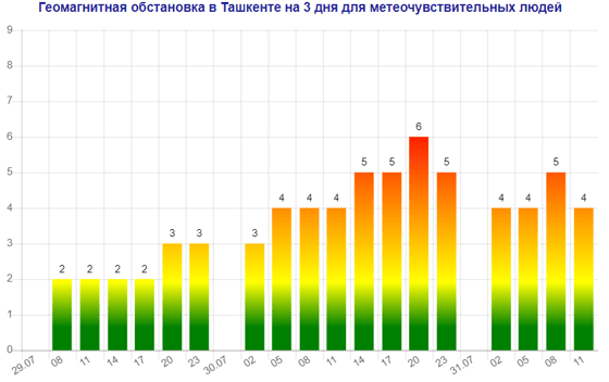 Завтра (30 июля) в Ташкенте будет наблюдаться магнитная буря мощностью шесть баллов, следует из данных сервиса Meteonova.