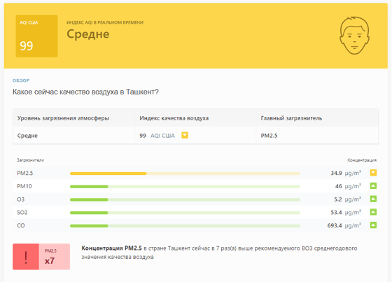 В 09:45 станция мониторинга в столице Узбекистана показывала результат в 99 AQI. Концентрация PM2.5 — в 7 раз выше рекомендуемого ВОЗ среднегодового значения качества воздуха.
