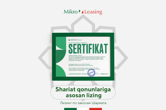 Инициатива подтверждена Управлением Мусульман Республики Узбекистан и сертифицирована «ASSOODIQ CONSULT», что делает Mikro Leasing одной из первых компаний в своей сфере, предлагающих такие условия.